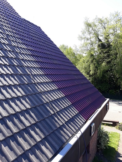 Nach der Reinigung strahlt das Dach wieder in der Farbe als es damals gedeckt wurde. Die Algen,Sporen und Pilze sind nun weg.